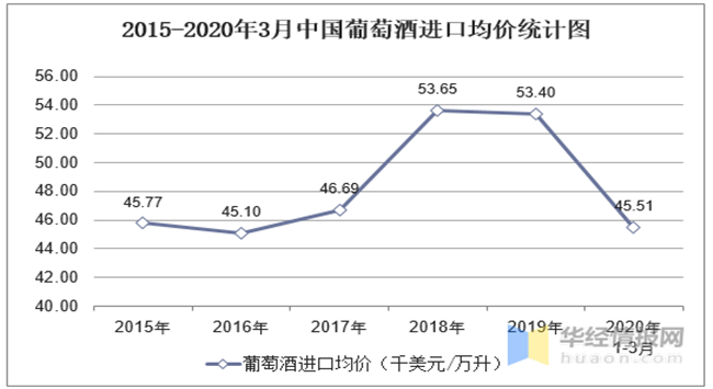 華經產業研究院數據顯示:2020年1-3月中國葡萄酒進口數量為13084萬升,相比上年同期減少了2778.2萬升,降幅為17.4%;進口金額為595419千美元,相比上年同期減少了208930千美元,降幅為25.1%;2020年1-3月中國葡萄酒進口均價為45.51千美元/萬升。