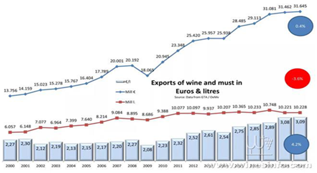 散酒貿(mào)易總量趨于平緩,而總價方面的上升也開始出現(xiàn)了疲軟的這個勢頭。大家越來越希望拿到高質(zhì)量的葡萄酒。作為散酒出口大國,散酒貿(mào)易收縮的局面對于西班牙的出口是個威脅。