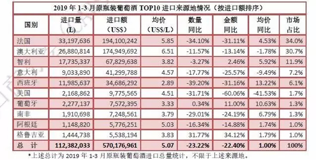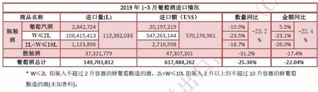 近日,中國(guó)食品土畜進(jìn)出口商會(huì)酒類(lèi)進(jìn)出口商分會(huì)發(fā)布2019年一季度酒類(lèi)進(jìn)口統(tǒng)計(jì)報(bào)告。報(bào)告顯示,一季度,進(jìn)口酒類(lèi)市場(chǎng)整體呈下行態(tài)勢(shì),且降幅仍在擴(kuò)大。其中,葡萄酒進(jìn)口延續(xù)跌勢(shì),量額跌幅均逾兩成。進(jìn)口量1.5億升,進(jìn)口額6.2億美元,約占酒類(lèi)進(jìn)口總額的55.4%。