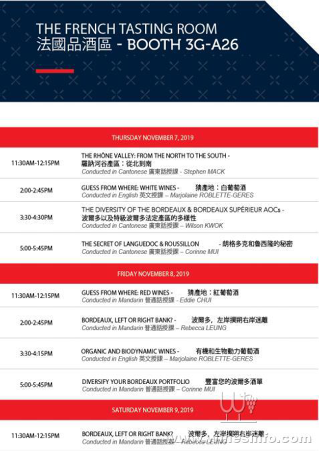 今年酒界盛事香港國際美酒展(11 月 7 至 9 日)將迎來 70 多家法國展商。佔(zhàn)地約 513 平方米的法國館位于香港會議展覽中心 3F-G,由法國商務(wù)投資署(Business France)及新阿基坦大區(qū)食品協(xié)會 (AANA)籌辦。在香港市場排名第一的法國葡萄酒和烈酒分別佔(zhàn) 60%及 40%市場份額。 French Tasting Room 品酒區(qū)繼去年成功推出后,今年將重現(xiàn)法國館。法國展商將在共 9 場主題品酒環(huán)節(jié)上陳列各款佳釀,這對于進(jìn)口商、專業(yè)人士及業(yè)馀愛好者來說是一個難能可貴的大滿足機(jī)會,品嚐出產(chǎn)自法國的純釀。