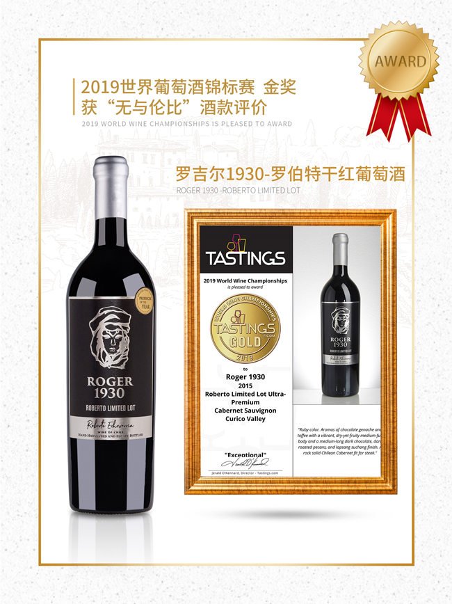 羅吉爾1930-羅伯特紅葡萄酒呈深邃的寶石紅色;酒香非常柔和,伴有精致的黑加侖,黑李子的果香以及甘草、煙熏的香氣;口感優雅豐富,層次鮮明且多變,單寧強勁,令人十分愉悅。在榮獲2020柏林葡萄酒大獎賽金獎的榮譽之前,就已經獲得了2019世界葡萄酒錦標賽金獎的榮譽,以及“無與倫比”酒款評價!